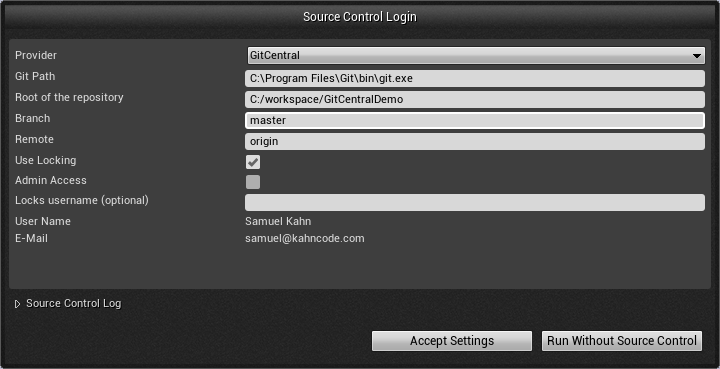 A popup will confirm that gitcentral has connected successfully. If you encounter an error, the Output Log window will give you more information.